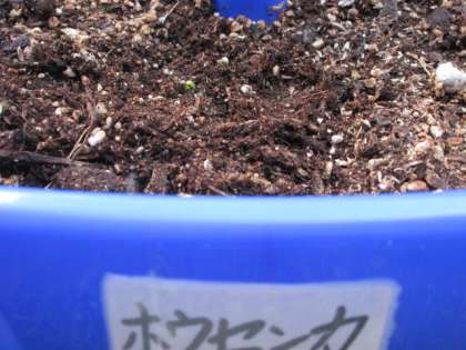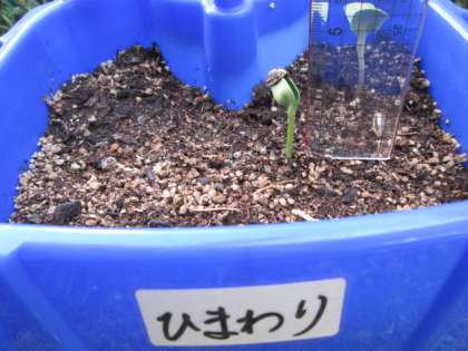 ホウセンカがようやく芽を出しそうだよ。土が重いのかなあ。がんばれがんばれ!地上はもう少しだ。ひまわりとオクラは、種を帽子みたいにかぶって、背筋をピーンと伸ばしているみたいだよ。