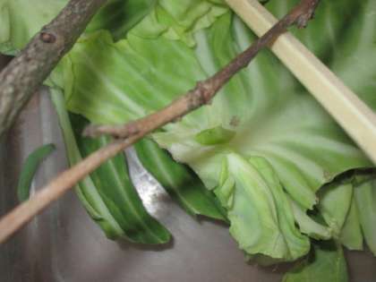 モンシロチョウの幼虫の中の1匹は、朝は動いていたのに、夕方には動かなくなっていたよ。じっとしていたよ。さなぎになり始めたみたいだ。木の枝をいれておいた。