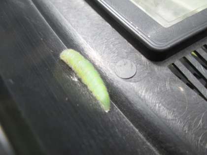 卵からかえって15日目。モンシロチョウの幼虫の1匹は、虫かごのふたにくっついたまま動かなくなったよ。よく見ると白い糸みたいなものを出しているね。もしかして、さなぎになる準備をしているのかもしれないね。昨日観察したさなぎは、黄色っぽくとげとげしていたよ。このあとどうなるのかなー。チョウになる日が楽しみだ!