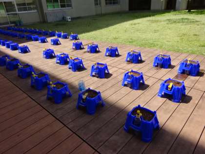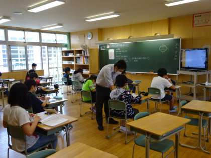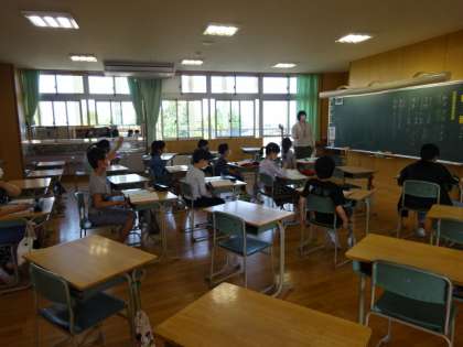 各学級、およそ半分の人数ですが、みんな真剣に学習に取り組んでいました。1年生が植えたアサガオの鉢も、距離をとって置いてあります。