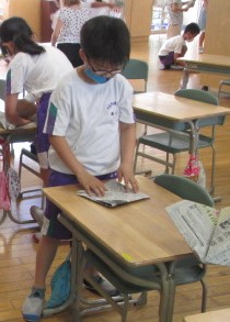 体育の時間に、紙鉄砲で投げる感覚を養いました。「すごい大きい音出たよ」「たくさんやったら新聞紙破けたよ」と言いながら、楽しく活動しました。