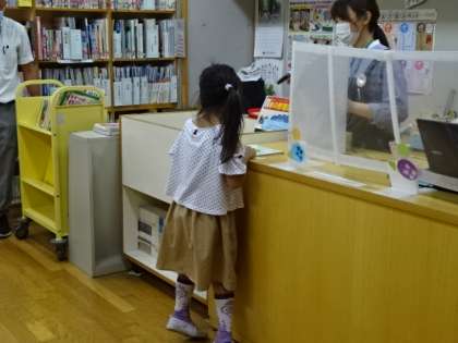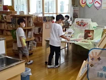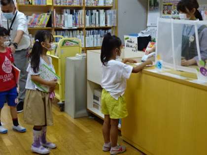 1年生が図書室で本を借りていました。借りる本を選んで、本の借り方を学ぶ。これも大切な学習です。