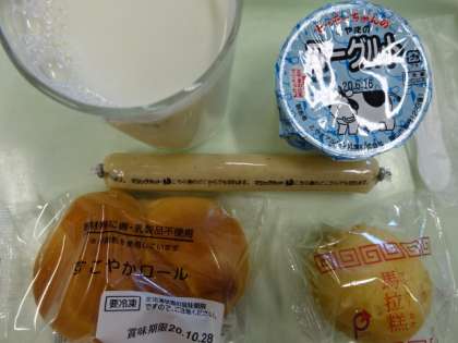 今日から、簡易給食が始まりました。献立は、ロールパン、牛乳、魚肉ソーセージ、黒糖蒸しパン、ヨーグルトです。