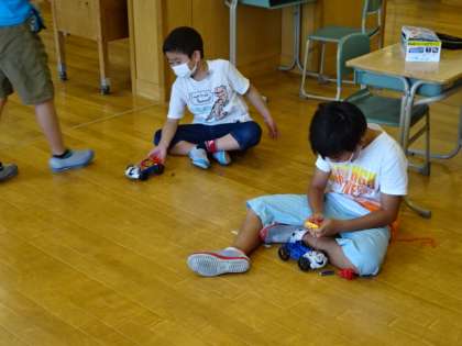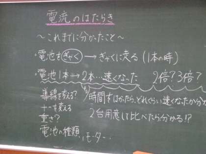 モーターカーを走らせて気付いたことを話し合い、そこから次の実験が始まっています。もっと速く走らせるにはどうしたらよいだろう?いろんな実験が始まっています。