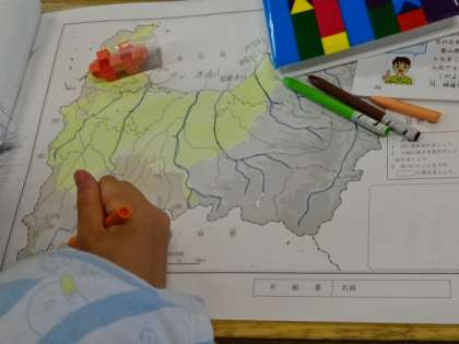 富山県の地形はどうなっているのだろう?山はどこにあって、平野はどの辺りに広がっていて、どんな川が流れているのでしょう?色を塗りながら覚えています。