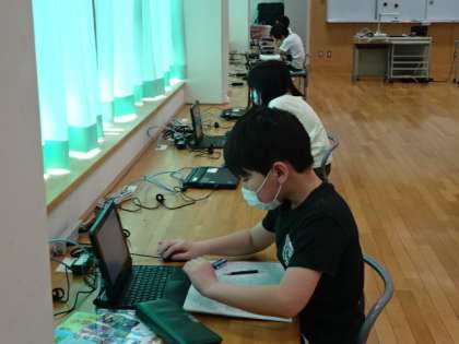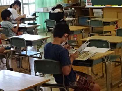 5年生も、本や資料集で調べる子供とインターネットで調べる子供に分かれて学習をしています。暖かい地方に住んでいる人々の生活について調べています。