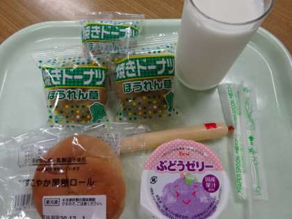 今日の簡易給食の献立は、黒糖ロールパン、牛乳、チーズかまぼこ、ほうれん草ドーナツ、ぶどうゼリーでした。