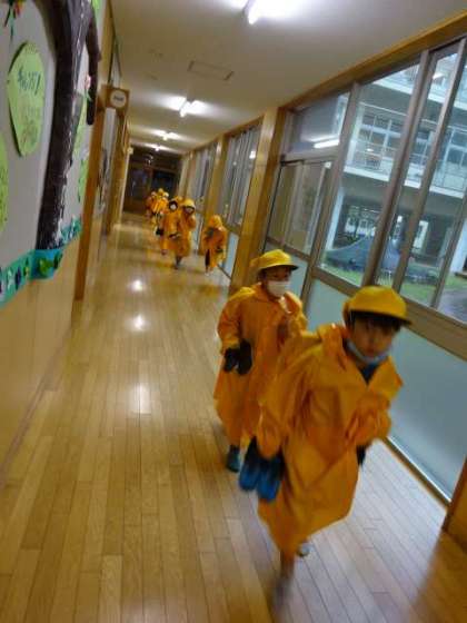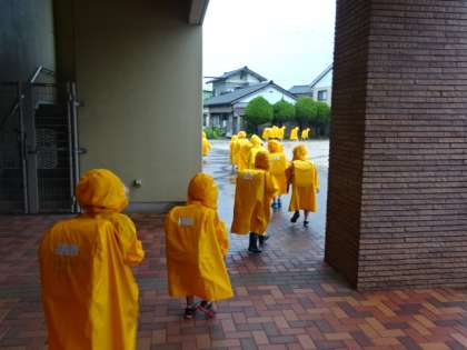 昼前から雨が降り出しました。久しぶりの雨です。1年生は、黄色いカッパを着て下校です。気を付けて帰ってね。