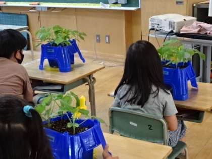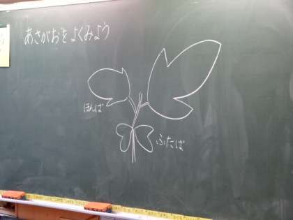 気温が高くなってきたので、アサガオの成長も早いです。本葉が子供の手のひらよりも大きくなっているのもありました。