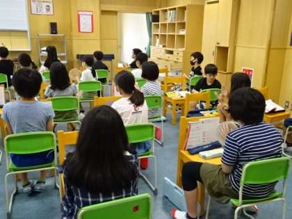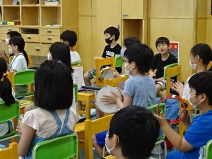 今日は、曲に合わせて打楽器をたたく練習です。楽器はそれぞれ違うけど、リズムに合わせて、心を一つにしてがんばろう。