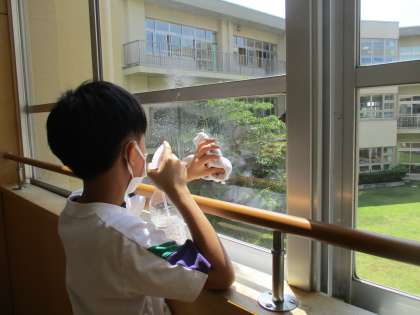 掃除の時間には、それぞれの役割に真剣に取り組む姿が見られました。スプレーと布巾を使って窓を拭いたり、ほうきで廊下の端のゴミを集めたりするなど、一生懸命でした。先週から「反省会」も掃除後に行っています。これから、子供たちのたくさんの頑張る姿を見られることを期待しています。