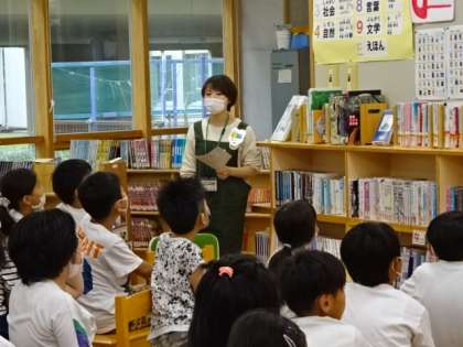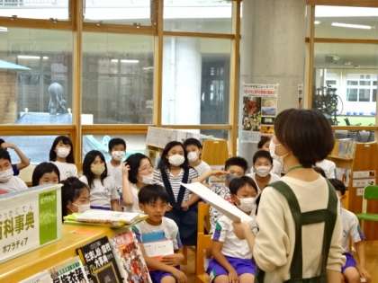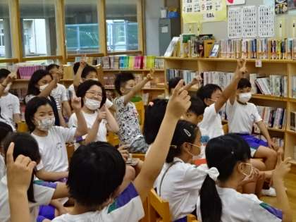4年生が、図書室オリエンテーションを受けていました。図書室にある本は、どんな順番に並んでいるのだろうか、本のラベルにはどんな意味があるのだろうかなど、クイズ形式で楽しく学んでいました。