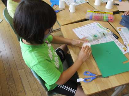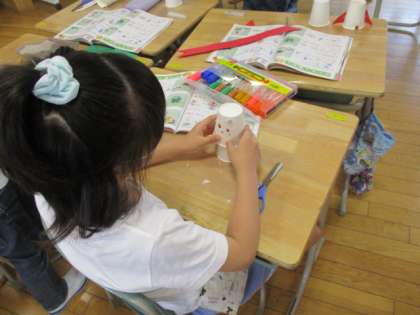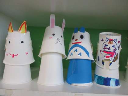 生活科で「ぴょん うさぎ」を作りました。頭がゴムの力で跳ね返り、その動きを楽しみました。見てみるといろいろな「ぴょん ○○」ができあがりました。