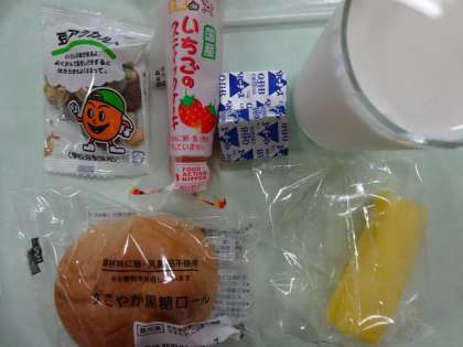 今日は、黒糖ロールパン、牛乳、味付ビーンズ、ポケットチーズ、いちごのスティックケーキ、冷凍パインでした。