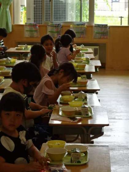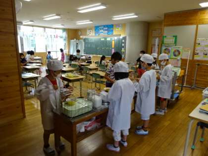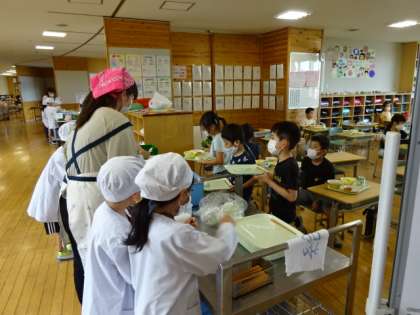 久しぶりに通常に近い給食が再開しました。小さい学年も気を付けて配膳して、いただきます。