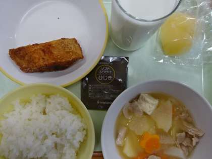 今日の給食は、ごはん、牛乳、あじの竜田揚げ、豚汁、冷凍りんご、しそひじきふりかけでした。豚汁には、花の形をしたにんじんが入っていたラッキーな人もいました。