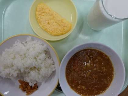 今日の献立は、ごはん、牛乳、キーマカレー、オムレツでした。キーマカレーには、にんにく、しょうが、豚挽肉、たまねぎ、にんじん、じゃがいも、白いんげん豆、ダイスチーズ等たくさんの具材が使われています。