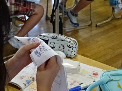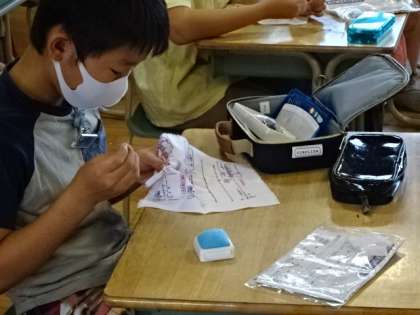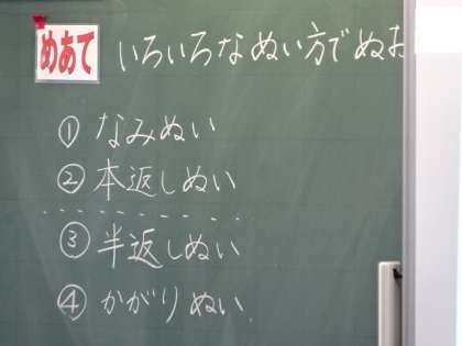 今日は、裁縫の時間です。まず、いろいろな縫い方があることを学んでいます。