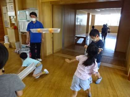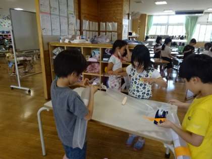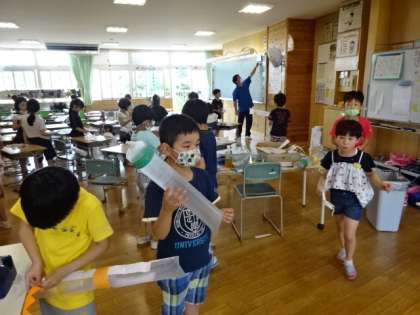 ふくろに空気を詰めて、おもりをつけて飛ばしています。工夫をしながら、いろいろなおもちゃを作る学習です。