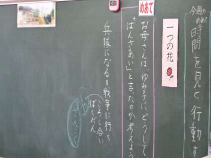 「一つの花」で読み取ったことを発表しています。よく手が挙がり、友達の話を真剣に聞いています。