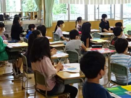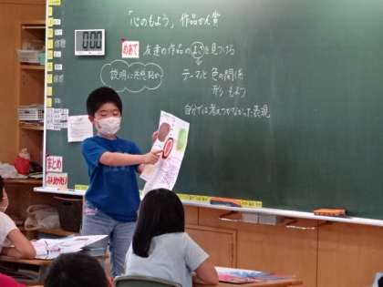絵の作品鑑賞です。まず、自分は何を描いたのか一人一人発表しています。聞いている人は、友達の作品のよさを見付けながら聞いています。