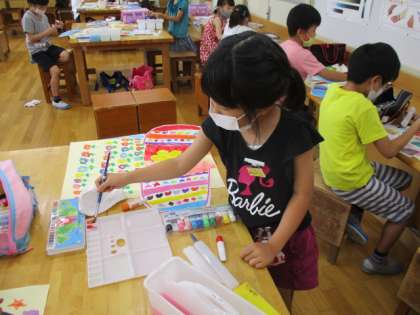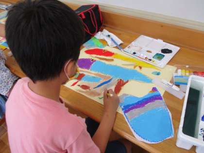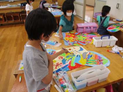 「ひみつのたまご」から生まれた物に水彩を使って、色を塗りました。