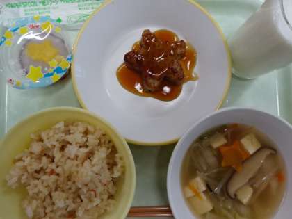 今日の献立は、五目ごはん、牛乳、星形ハンバーグ、豆腐スープ、七夕ゼリーでした。ハンバーグも星形、にんじんも星形、ゼリーも星形でした。