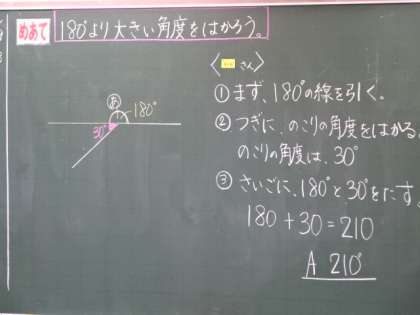 「180度より大きい角度をはかろう」分度器で1回ではかれるのは180度まで。180度より大きな角度は、工夫がいります。どんな方法があるかな?
