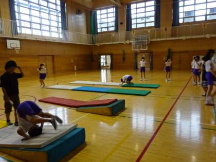 マット運動。やりたい技によって、場所を選んで練習に取り組んでいます。