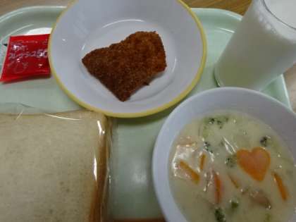 今日は、食パン、牛乳、ソフトカレイフライ、クリーム煮、いちごジャムでした。魚のフライは文字通り、とってもソフトでおいしかったです。
