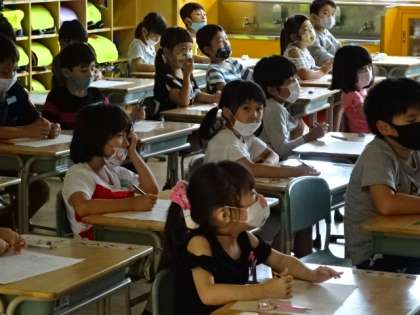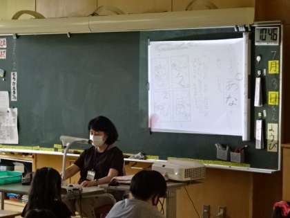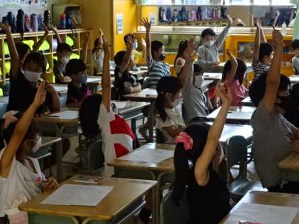 みんなで答え合わせをしています。正解には自信をもってみんな手が挙がっています。