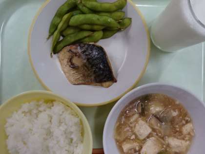 今日の献立は、ごはん、牛乳、さばの塩焼き、枝豆、豆腐と野菜のうま煮でした。夏は、やっぱり枝豆ですね。