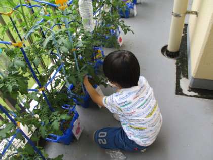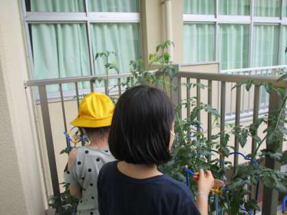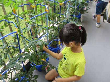ミニトマトが赤くなってきました。高さでは、子供たちの身長を超えていくのもありました。
