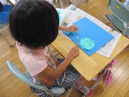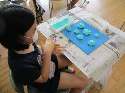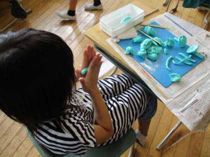 図工では、「にぎにぎ ねんど」を行いました。粘土をにぎってできた形から、想像してドラゴンやお花など作りました。