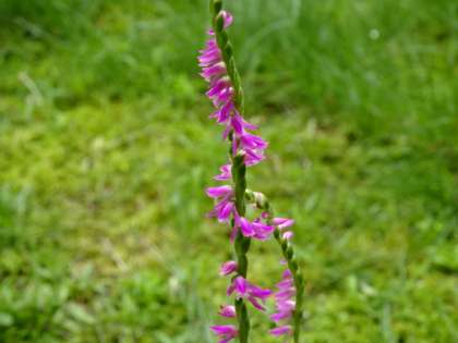 中庭をよく見ると、ネジバナがいっぱい咲いています。ねじれて花がついていて、おもしろい花です。