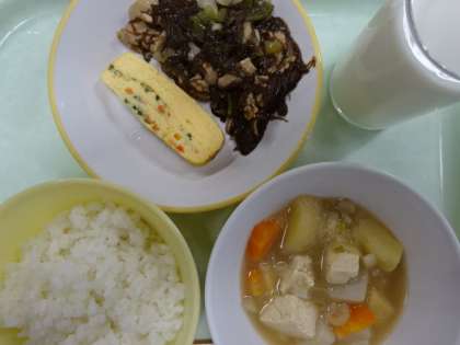 今日の献立は、ごはん、牛乳、千草焼き、もずくのチャプチェ、ごまけんちんでした。