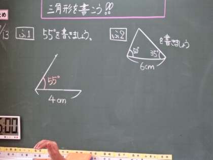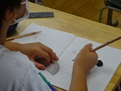 分度器を使って、角度や三角形を書こう。正確に書かねば・・・