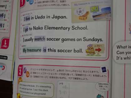 「自分の宝物を伝え合おう」ということで、メモを作っています。もちろん、英語で伝え合います。