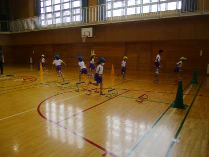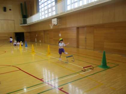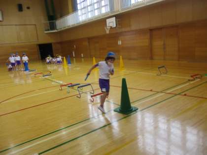 2年生は、にこにこハードルリレーを行いました。自分たちで楽しくなるようにハードルやコーンを工夫して置きました。