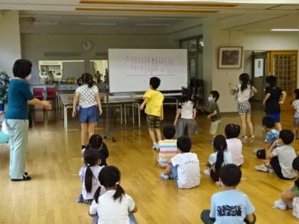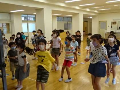 曲に合わせて、上に跳んだり、前に跳んだりしています。リズムに合わせて、楽しく体を動かせています。
