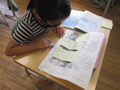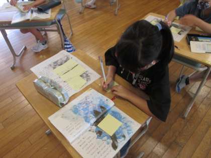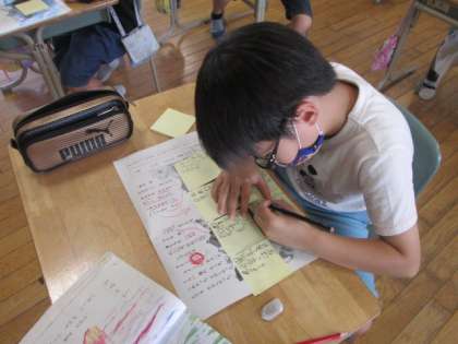 「まぐろが突っ込んできて、一人ぼっちになったスイミー」の様子を考えました。何度もお話を読んで、一生懸命に考える子供たちです。