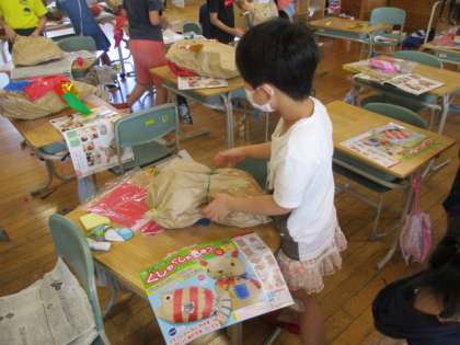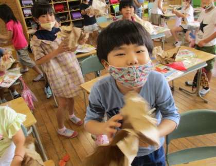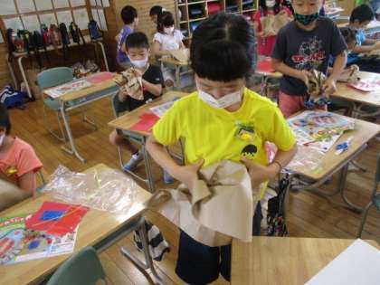 図工で、「くしゃくしゃぎゅっ」を行いました。ふくろをぐしゃぐしゃにして、ぎゅっとしたい友達を作りました。