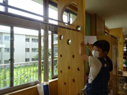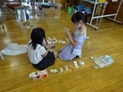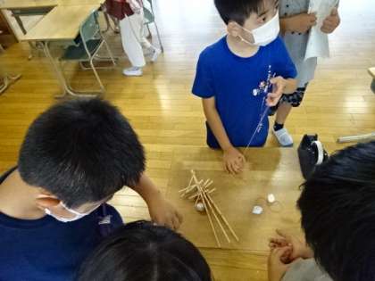 自分たちで作ったおもちゃ。遊び方を工夫して、その説明を考えています。