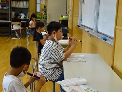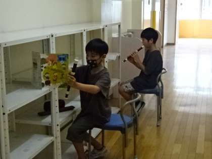 リコーダーの練習です。互いの距離をとるため、二つの教室や廊下を使ってやっています。