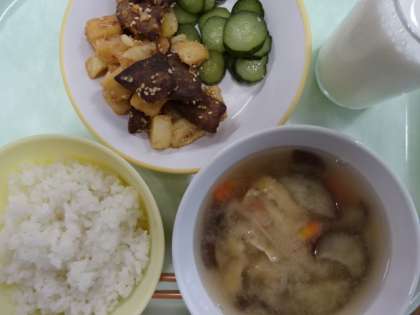 ごはん、牛乳、高野豆腐とレバーのごまからめ、きゅうりもみ、なすのみそ汁でした。