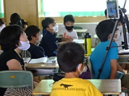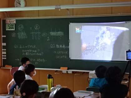 雨水の行方の学習です。降った雨が多すぎると、災害になってしまうことをビデオを見て学習しています。