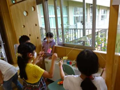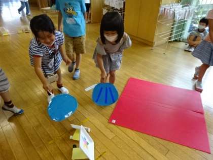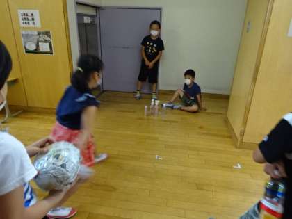 グループに分かれて、自分たちの作った手作りおもちゃで遊んでいます。人気があるのはどこかな?