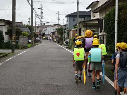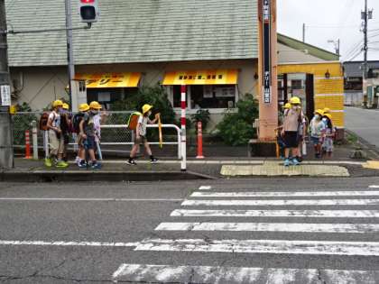 今日も、どんよりとした雲が広がっていて、ムシムシしています。そんな中、子供たちは傘を持ちながら、安全に気を付けて登校してきました。