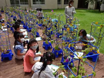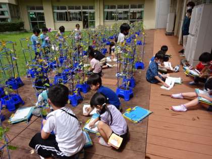 アサガオの観察カードを書こう。花や葉の形や大きさ、色などをしっかり見て書いています。