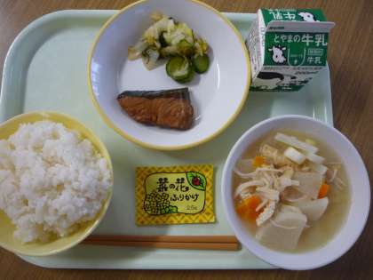 7月最後の日の給食は、ごはん、牛乳、ふくらぎの照り焼き、昆布和え、呉汁、菜の花ふりかけでした。